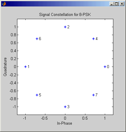 На рисунке ниже показана маркированная группировка сигналов с установленным разделением, которая используется блоком, когда M-ary число равно 8. Для получения информации о созвездиях других размеров см. [1].