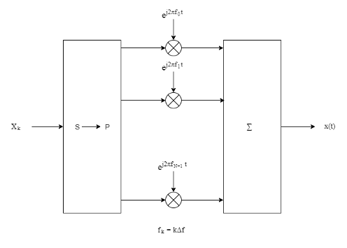 Модулятор OFDM состоит из последовательно-параллельного преобразования с последующим набором N комплексных модуляторов, индивидуально соответствующих каждой поднесущей OFDM.