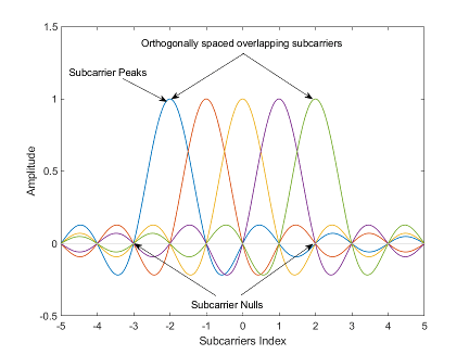 Операция OFDM делит высокоскоростной поток данных на субпотоки с более низкой скоростью передачи данных путем разложения полосы частот передачи на N смежных индивидуально модулированных поднесущих. Множество параллельных и ортогональных поднесущих переносят выборки с почти той же полосой пропускания, что и широкополосный канал. Используя узкие ортогональные поднесущие, сигнал OFDM повышает устойчивость по частотно-избирательному каналу замирания и устраняет помехи соседних поднесущих. Межсимвольные помехи (ISI) уменьшаются, поскольку субпотоки с меньшей скоростью передачи данных имеют длительность символов, большую, чем разброс задержки канала.