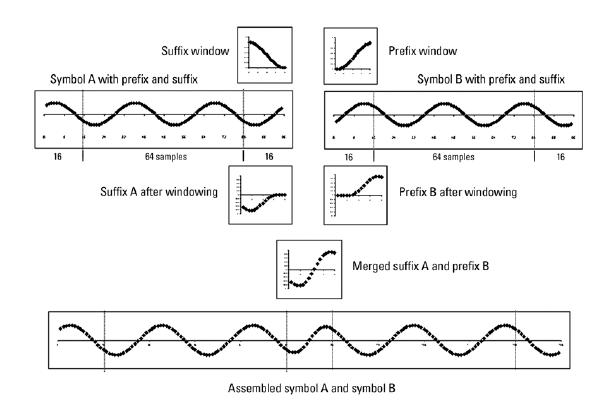 Для создания циклического суффикса первые выборки NWIN данного символа добавляются к концу этого символа. Однако для соответствия стандарту 802.11g, например, длина символа не может быть произвольно увеличена. Вместо этого циклический суффикс должен перекрываться по времени и эффективно суммируется с циклическим префиксом следующего символа. Этот перекрывающийся сегмент является местом применения оконной обработки. Применяются два окна, одно из которых является математическим обратным другому. Первое приподнятое косинусное окно применяется к циклическому суффиксу символа k и уменьшается от 1 до 0 по его длительности. Второе приподнятое косинусное окно применяется к циклическому префиксу символа k + 1 и увеличивается от 0 до 1 по его длительности. Этот процесс обеспечивает плавный переход от одного символа к другому.