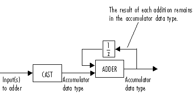 Блоки Toolbox™ связи с фиксированной точкой, которые должны содержать результаты суммирования для дальнейшего вычисления, обычно позволяют указать тип данных и масштаб накопителя. Большинство таких блоков, приведённых к типу данных накопителя перед суммированием: