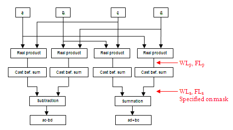 Блок-схема сигналов для комплексного умножения a + ib и c + id