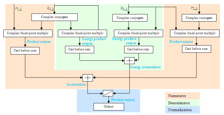 Комплексное произведение в числителе для объединения разнесения. Для получения дополнительной информации см. раздел «Сигналы фиксированной точки» на этой странице справки.