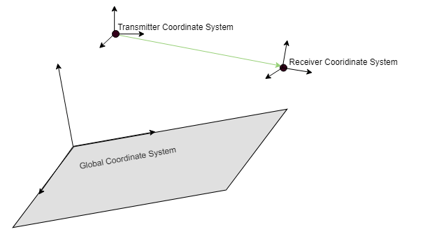 На этом изображении показана ориентация электромагнитных полей в глобальной системе координат (ГСК) и локальных системах координат передатчика и приемника.