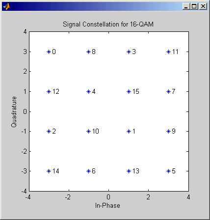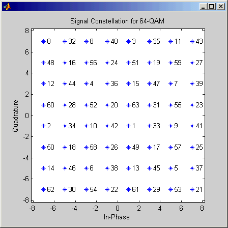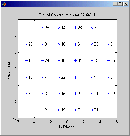 На рисунках ниже показаны маркированные комбинации сигналов с установленным разделением, которые блок использует, когда M-ary число 16, 32, и 64. Созвездия других размеров см. Biglieri, E., D. Divsalar, P. J. McLane и M. K. Simon, Introduction to Trellis-Coded Modulation with Applications, New York, Macmillan, 1991.