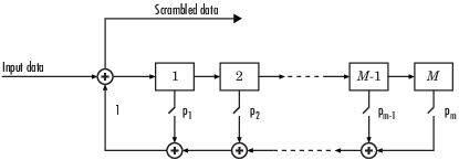 На каждом временном шаге ввод вызывает последовательное смещение содержимого регистров. С помощью параметра полинома Scramble можно задать состояние включения или выключения для каждого коммутатора скремблера.