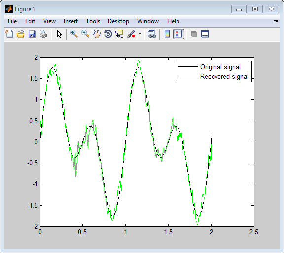 % Prepare to sample a signal for two seconds, % at a rate of 100 samples per second. Fs = 100; % Sampling rate t = [0:2*Fs+1]'/Fs; % Time points for sampling % Create the signal, a sum of sinusoids. x = sin(2*pi*t) + sin(4*pi*t); Fc = 10; % Carrier frequency in modulation phasedev = pi/2; % Phase deviation for phase modulation y = pmmod(x,Fc,Fs,phasedev); % Modulate. y = awgn(y,10,'measured',103); % Add noise. z = pmdemod(y,Fc,Fs,phasedev); % Demodulate. % Plot the original and recovered signals. figure; plot(t,x,'k-',t,z,'g-'); legend('Original signal','Recovered signal');