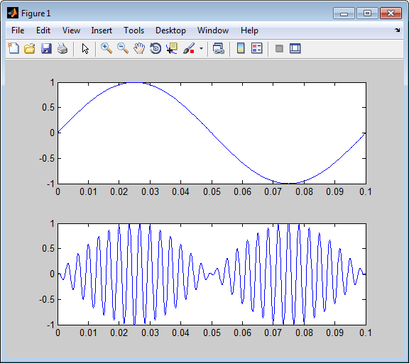 Например, если t измеряет время в секундах, затем вектор x ниже приведен результат выборки синусоидальной волны 8000 раз в секунду в течение 0,1 секунды. Вектор y представляет модулированный сигнал.