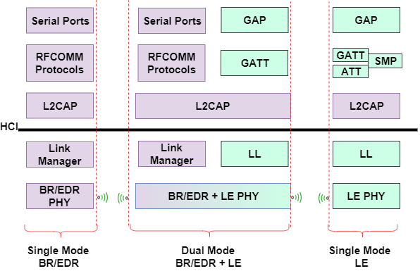 Bluetooth ® Special Interest Group (SIG) [1] и [2] определяют стек протоколов для технологии Bluetooth с низкой энергией (BLE) и базовой скоростью/повышенной скоростью передачи данных Bluetooth (BR/EDR). Основными целями этих спецификаций являются разработка интерактивных услуг и приложений по совместимым радиокомпонентам и протоколам передачи данных .