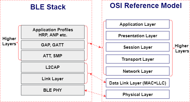 На предыдущем рисунке стек протоколов BLE показан вместе с эталонной моделью OSI.