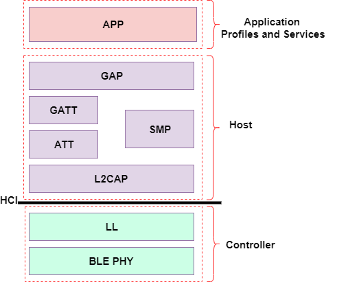 Уровень контроллера включает в себя BLE PHY, LL и интерфейс главного контроллера на стороне контроллера (HCI).