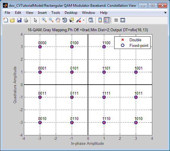 Можно наложить и сравнить эффект, который два различных выбора типа данных оказывают на сигнальное созвездие. Например, можно сравнить эффект изменения типа выходных данных из double кому Fixed-point на сигнальном созвездии.