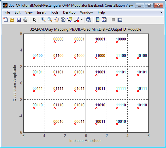 Щелкните Вид (View) Созвездие (Constellation) и просмотрите результаты. Несмотря на то, что вы не нажали кнопку Применить (Apply), сделав эти изменения частью модели, график созвездия по-прежнему обновляется. График показывает порядок серого созвездия, используя битовое представление символов.