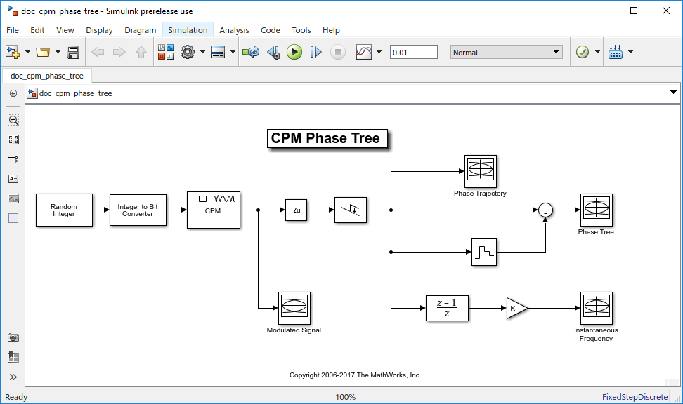 Этот пример, doc_cpm_phase_treeиспользует различные блоки Communications Toolbox™, DSP System Toolbox™ и Simulink ® для моделирования сигнала CPM основной полосы частот.