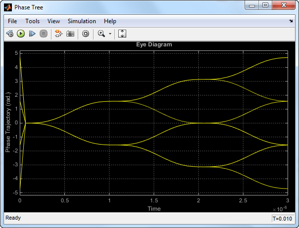 В блоке Дерево фаз (Phase Tree) отображается дерево фаз сигнала. Фаза CPM обрабатывается несколькими простыми блоками, чтобы облегчить просмотр формирования импульсов CPM. Эта обработка удерживает фазу в начале интервала символов и вычитает ее из сигнала. При этом фаза сбрасывается на ноль каждые три символа. Результирующий график показывает множество фазовых траекторий, которые могут быть взяты сигналом из любой данной эпохи символа.