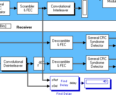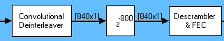 Параметр Delay в блоке Delay имеет значение 800 потому что это минимальное количество выборок, необходимое для сдвига 41-й выборки одного кадра 840 выборок в первую выборку следующего кадра 840 выборок. Другими словами, сумма собственной задержки 40 выборок (из процесса перемежения/обращенного перемежения) и искусственной задержки 800 выборок является полным кадром данных, а не частичным кадром.