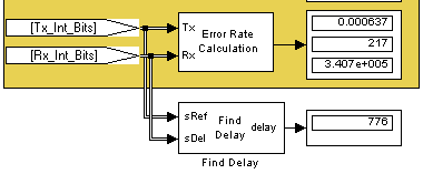 Общая задержка относительно блока вычисления частоты ошибок. Блок вычисления частоты ошибок, который вычисляет значение с меткой Interleaved BER требуется значение параметра задержки приема, эквивалентное одному кадру. Параметр задержки приема измеряется в выборках, и каждый входной кадр в блок вычисления частоты ошибок содержит 776 выборок. Кроме того, частота кадров на выходных портах всех блоков, вызывающих задержку, в перемежающемся тракте равна частоте кадров на входе блока вычисления частоты ошибок. Поэтому правильным значением параметра задержки приема является 776 образцы.