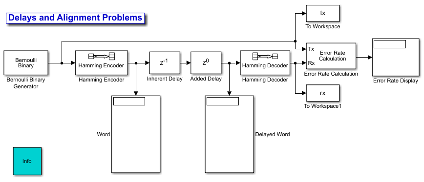 Суммирование задержек. Никакие другие блоки в части модели между двумя входными сигналами внутреннего блока частоты ошибок не вызывают каких-либо задержек. Общая задержка тогда (2 + 3 + 3) * 2 = 16 образцы. Это значение можно использовать в качестве параметра задержки приема во внутреннем блоке частоты ошибок.