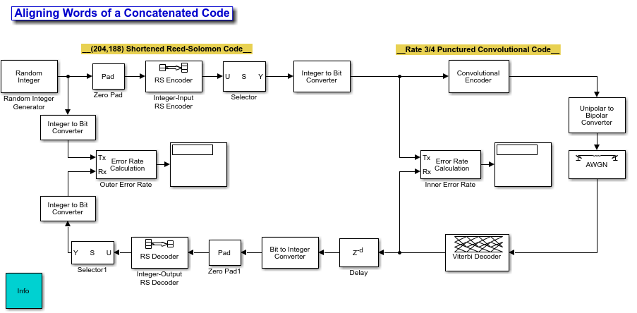 Выравнивание слов конкатенированного кода. Этот раздел описывает пример, который манипулирует задержкой между двумя частями кодового декодера с конкатенацией, поскольку первая часть включает в себя задержку от декодирования Витерби, в то время как вторая часть ожидает, что границы кадра будут совпадать с границами слов. Для открытия модели введите doc_concat в командной строке MATLAB. Он использует блочный и сверточный коды из commdvbt пример, но значительно упрощает общую конструкцию.