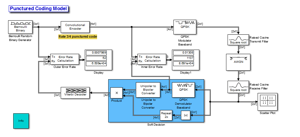 В этом разделе рассматривается модель проколотого кодирования, которая включает в себя задержки от декодирования, понижающей дискретизации и фильтрации. Два блока вычисления частоты ошибок в модели работают правильно, если и только если их параметры задержки получения точно отражают задержки в модели. Для открытия модели введите doc_punct в командной строке MATLAB.