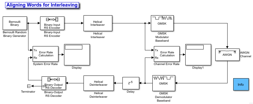 Выравнивание слов для перемежения. В этом разделе описан пример, который манипулирует задержкой перед обращенным перемежителем, поскольку путь между перемежителем и обращенным перемежителем включает задержку от демодуляции. Для открытия модели введите doc_gmskint в командной строке MATLAB.