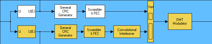 В примере ADSL данные следуют по одному из двух параллельных трактов, один с ненулевой задержкой, а другой с нулевой задержкой. Один тракт включает в себя сверточный перемежитель и обращенный перемежитель, в то время как другой делает это. Рядом с концом каждого тракта находится блок вычисления частоты ошибок, параметр задержки приема которого должен отражать задержку данного тракта. В остальном обсуждение делает наблюдение о периодах кадра в модели, а затем рассматривает путь для перемежающихся данных.