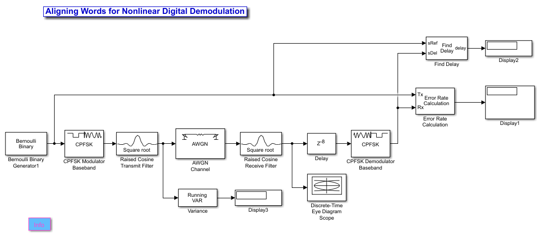 Эта модель включает в себя схему модуляции CPFSK и фильтр формирования импульсов. Для правильной работы демодуляции входной сигнал в блок демодулятора CPFSK должен иметь правильное выравнивание. Различные блоки в этой модели вводят задержки обработки. Из-за этих задержек входной сигнал в блок демодулятора CPFSK не находится в правильном выравнивании.