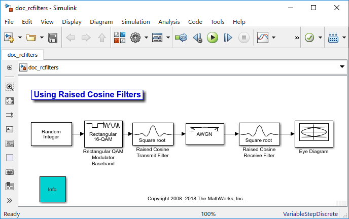 Этот пример иллюстрирует типичную установку, в которой передатчик использует фильтр с увеличенным косинусом квадратного корня для выполнения формирования импульсов, а соответствующий приемник использует фильтр с увеличенным косинусом квадратного корня в качестве согласованного фильтра. В примере показана диаграмма глаз из отфильтрованного принятого сигнала.