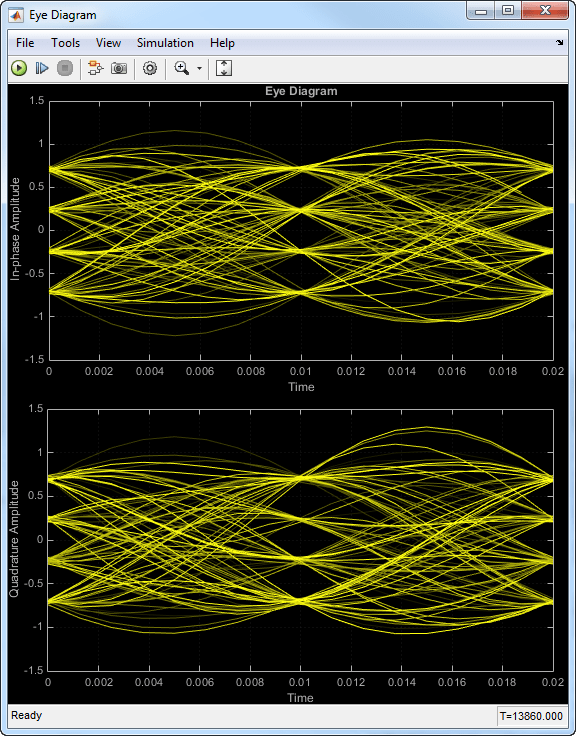 При выполнении моделирования создается следующая диаграмма глаз. Диаграмма глаз имеет два широко открытых «глаза», которые указывают соответствующие моменты времени, в которые следует производить выборку отфильтрованного сигнала перед демодуляцией. Это иллюстрирует отсутствие межсимвольных помех в моментах дискретизации принятого сигнала.