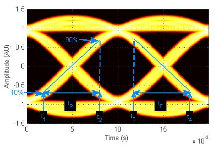 Время нарастания глаза - это среднее время между низким и высоким пороговыми значениями, определенными свойством EargingThreshold объекта настройки измерения глаза. Время подъема рассчитывается от 10% до 90% амплитуды глаза.