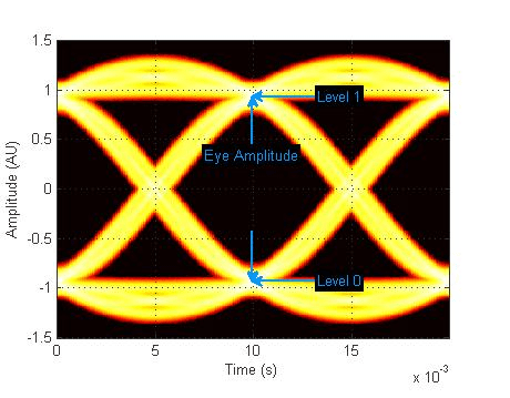 Амплитуда глаза, измеренная в единицах амплитуды (AU), определяется как расстояние между двумя соседними уровнями глаза. Для сигнала NRZ существует только два уровня: высокий уровень (уровень 1 на рисунке) и низкий уровень (уровень 0 на рисунке). Амплитуда глаза - это разность этих двух значений.