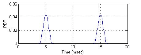 Поскольку в этом примере предполагается использование двух символов на трассировку, среднее значение PDF в этой области указывает на наличие двух точек пересечения.