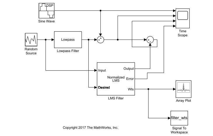 ex_codegen_dsp модель реализует простой адаптивный фильтр для удаления шума из сигнала при одновременной идентификации фильтра, характеризующего частотное содержание шума. Чтобы открыть эту модель, введите следующую команду в командной строке MATLAB: