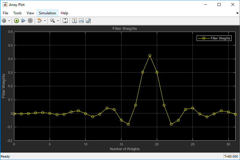 График массива показывает последние 32 веса фильтра, для которых фильтр LMS эффективно адаптировал и отфильтровал шум из сигнала.