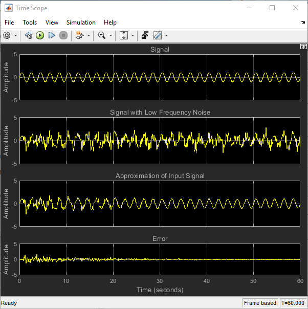 Моделирование модели. Временная область показывает входные и отфильтрованные характеристики сигнала.