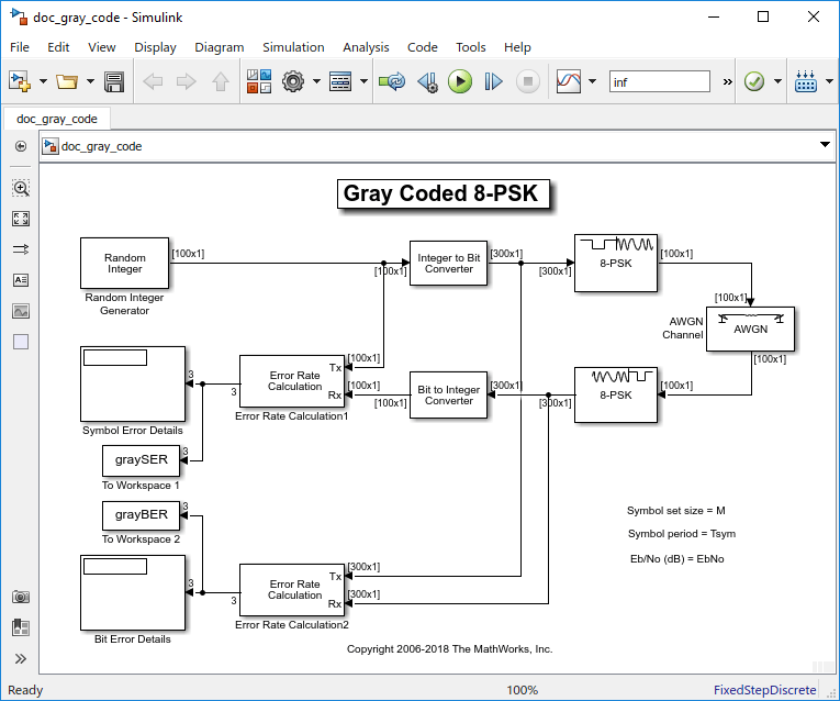 Эта модель, doc_gray_code, показывает линию связи, использующую модуляцию 8-PSK с серым кодированием. Серое кодирование - это метод, часто используемый в многоуровневых схемах модуляции для минимизации частоты битовых ошибок путем упорядочения символов модуляции так, чтобы двоичные представления соседних символов отличались только на один бит.