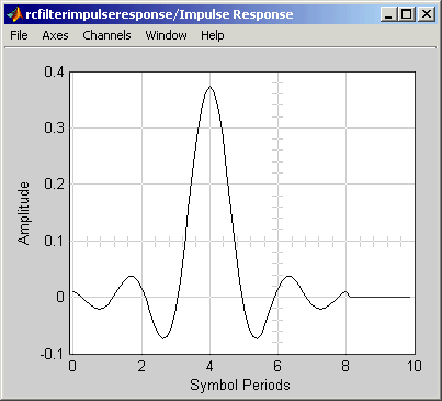 Например, квадратно-корневой косинусный фильтр, импульсная характеристика которого показана на следующем рисунке, использует параметр Filter в символах 8 в блоке фильтра. На чертеже начальная импульсная характеристика мала, и пиковая импульсная характеристика возникает в четвертом символе.