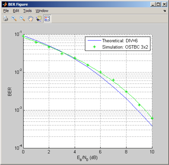 На рисунке ниже сравнивается смоделированная BER для диапазона значений EbNo с теоретическими результатами для порядка разнесения шесть.