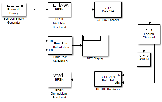 Модель показана на следующем рисунке. Чтобы открыть модель, введите doc_ostbc32 в командной строке MATLAB. Моделирование создает случайный двоичный сигнал, модулирует его с использованием технологии двоичной фазовой манипуляции (BPSK), а затем кодирует форму сигнала с использованием ортогонального пространственно-временного блочного кода со скоростью 34 для передачи по каналу замирания. Канал замирания моделирует шесть независимых линий связи из-за конфигурации трех передающих с помощью двух приемных антенн в качестве однонаправленных процессов релеевского замирания. Моделирование добавляет белый гауссов шум в приемнике. Затем он объединяет сигналы от обеих приемных антенн в один поток для демодуляции. Для этого процесса комбинирования модель предполагает полное знание коэффициентов усиления канала в приемнике. Наконец, моделирование сравнивает демодулированные данные с исходными переданными данными, вычисляя частоту битовых ошибок. Моделирование заканчивается после обработки 100 ошибок или 1e6 битов, в зависимости от того, что наступит раньше.