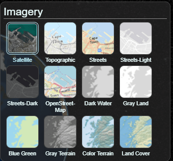 Можно выбрать базовые карты с помощью селектора базовых карт. Необходимо активное подключение к Интернету для всех базовых карт, кроме Dark Water. Доступны следующие опции: