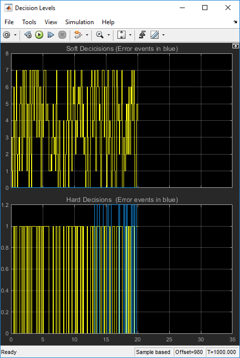 В окне Уровни решения (Decision Levels) желтым цветом показаны различные уровни мягкого решения на верхнем графике и двоичные жесткие решения на нижнем графике. Это окно также указывает синим цветом, когда возникают ошибки.