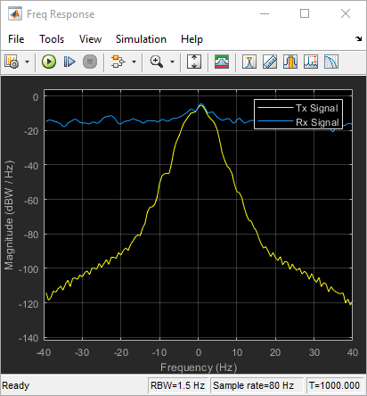 В окне Freq Response отображается частотная характеристика сигнала GMSK до и после канала AWGN.