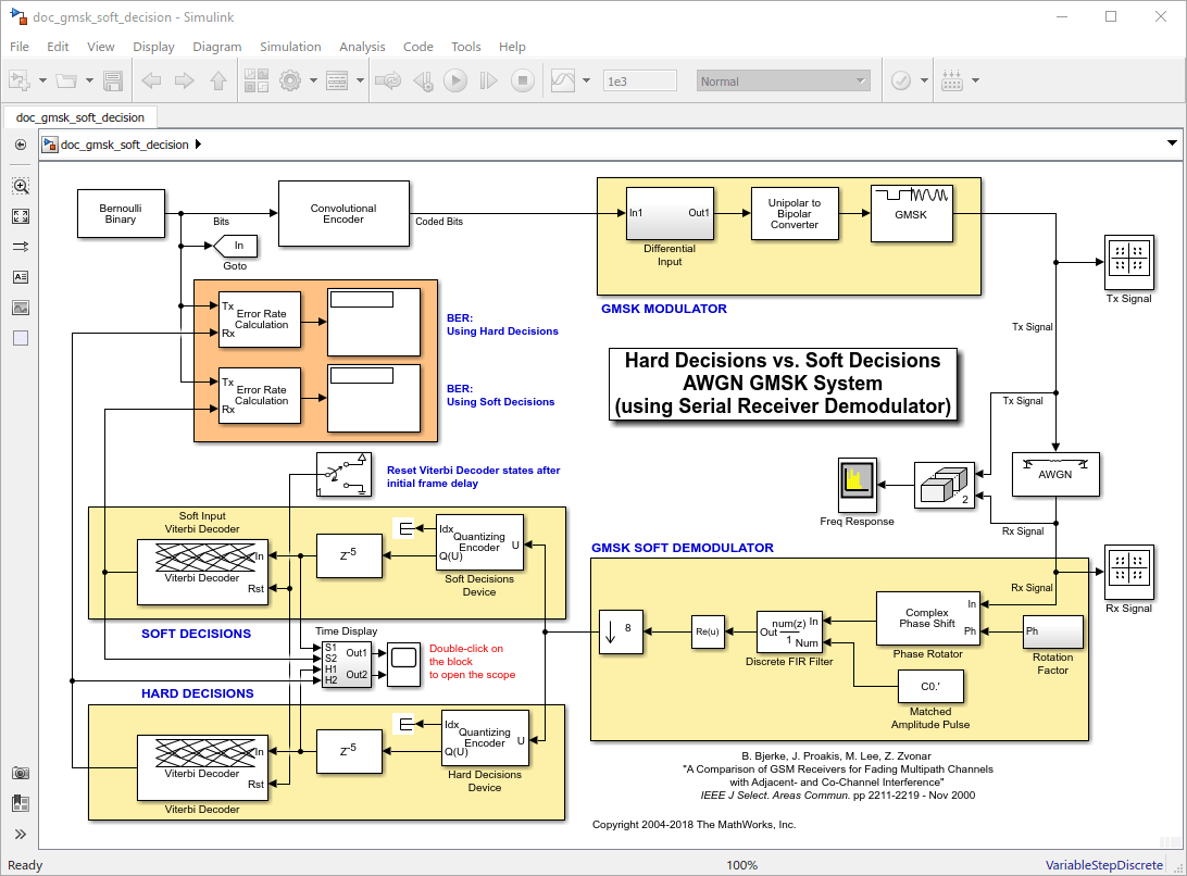 Эта модель показывает систему, которая включает сверточное кодирование и модуляцию GMSK. Приемник в этой модели включает в себя два параллельных пути, один из которых использует мягкие решения, а другой - жесткие решения. Модель использует коэффициенты битовых ошибок для двух путей, чтобы проиллюстрировать, что приемник мягкого решения работает лучше. Это следует ожидать, поскольку мягкие решения позволяют системе сохранять больше информации из операции демодуляции для использования в операции декодирования.