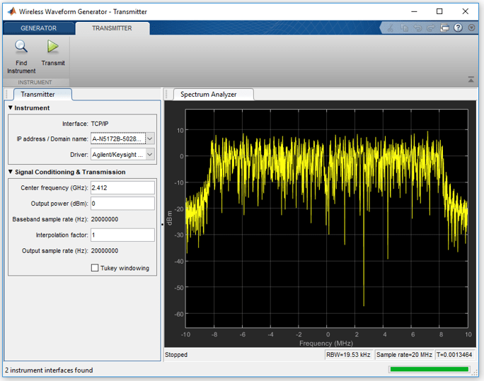 Создайте сигнал, который можно передать с помощью подключенного лабораторного тестового прибора. Приложение Wireless Waveform Generator может передавать с помощью инструментов, поддерживаемых rfsiggen(Панель инструментов управления приборами).