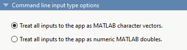 При запуске исполняемого автономного приложения в командной строке по умолчанию используется тип ввода char. Можно сохранить это значение по умолчанию или выбрать интерпретацию всех входных данных как числовых двойников MATLAB.