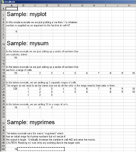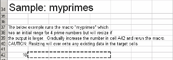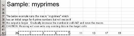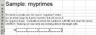 Эта функция автоматически изменяет размер, если возвращаемый выходной сигнал превышает указанный диапазон. Измените значение в A42 ячейки на число больше 10. Затем повторно запустите макрос. Выходные данные возвращают все простые числа, меньшие, чем число, введенное в A42 ячеек.