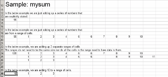 Четвертая (ячейка A30) принимает комбинацию объекта диапазона и явно заявленных значений, добавляет их и возвращает результат 16 (=mysum(10,B30:D30)).