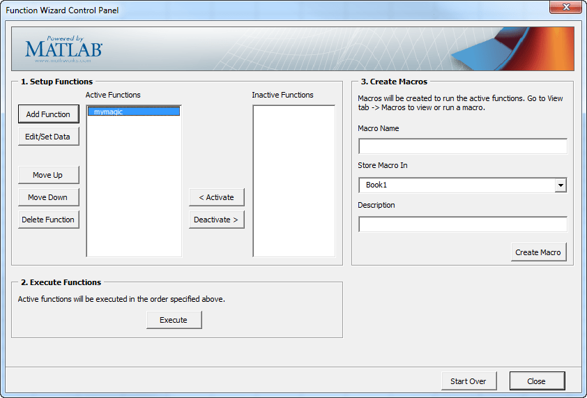Мастер функций позволяет передавать значения листа Microsoft Excel (Excel 2000 или более поздней версии) в скомпилированную модель MATLAB, а затем возвращать выходные данные модели в ячейку или диапазон ячеек на листе.