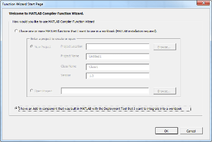 На начальной странице мастера функций выберите параметр У меня есть компонент надстройки, который был встроен в MATLAB с помощью средства развертывания, которое требуется интегрировать в рабочую книгу.