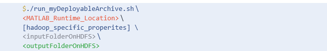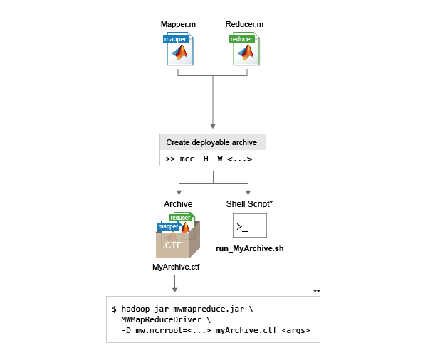 Чтобы упростить включение развертываемого архива (.ctf файл) в задание сокращения отображения Hadoop, как приложение компилятора Hadoop, так и mcc создать сценарий оболочки вместе с развертываемым архивом. Сценарий оболочки имеет следующее соглашение об именовании: run_<deployableArchiveName>.sh